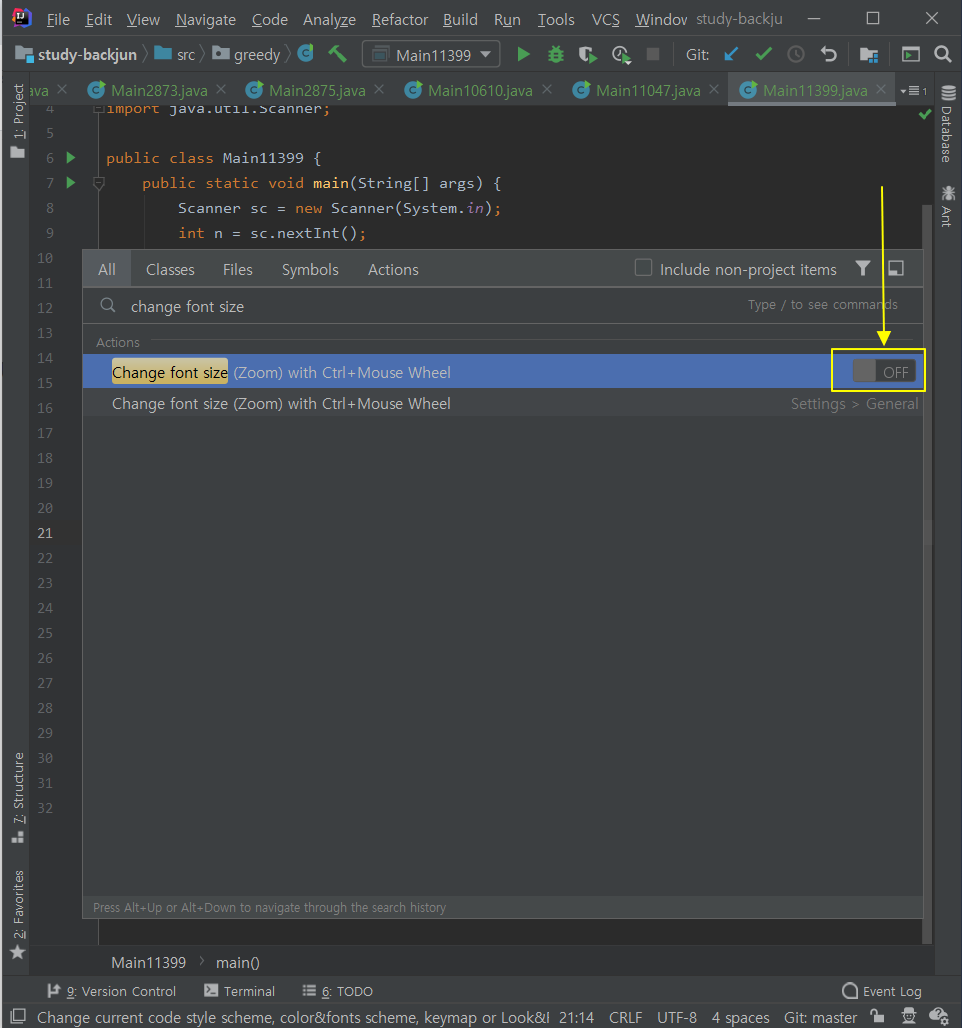 1. shift+shift로 검색할수 있는 창이 나오면 change font size라고 검색
