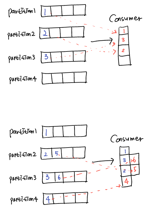 카프카는 메세지의 순서를 보장해 주지 않는다. (단, partition이 1일 경우에는 순서를 보장할 수 있다.)