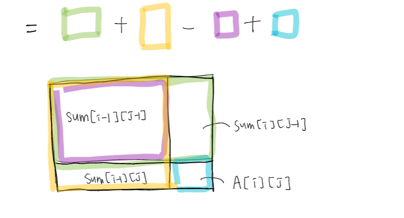 = Sum[i-1][j]+Sum[i][j-1] -Sum[i-1][j-1] +A[i][j]