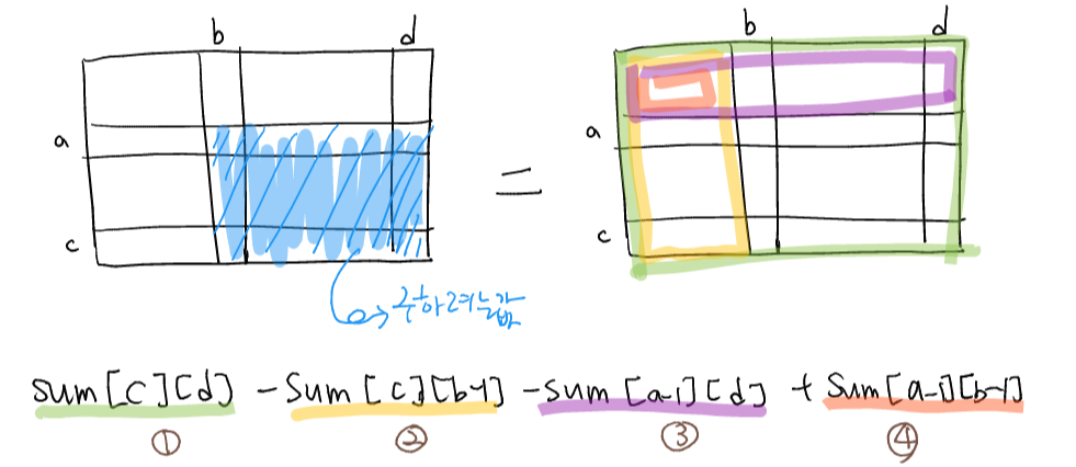 Sum[c][d] - Sum[c][b-1] - Sum[a-1][d] + Sum[a-1][b-1]