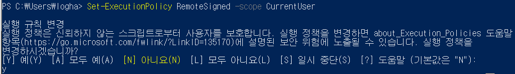 PS C:\Users\logha> Set-ExecutionPolicy RemoteSigned -scope CurrentUser