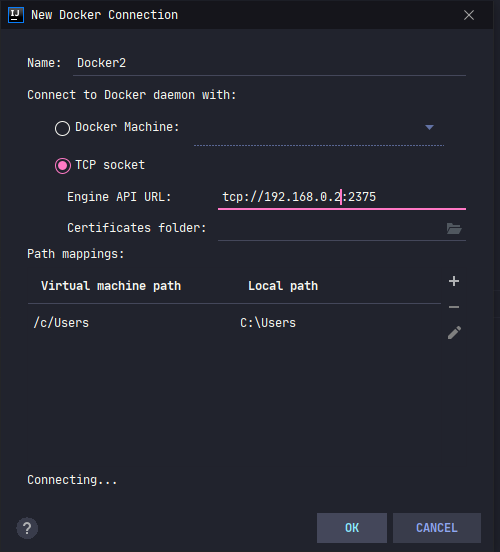 - New Docker Connection > Name, TCP socket 정보 입력 후 저장