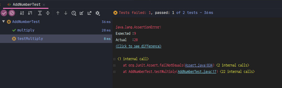 testMuliply() 메소드에서 기대했던 값 20은 실제로 계산값이 9와 다르므로 failed가 출력된 것을 확인 할 수 있다.