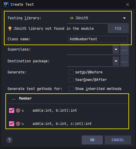 PS. 만약 아래 처럼 JUnit5 라이브러리를 찾을수 없다는 경고가 나오면 FIX버튼을 눌러 다운로드 해주면 된다.