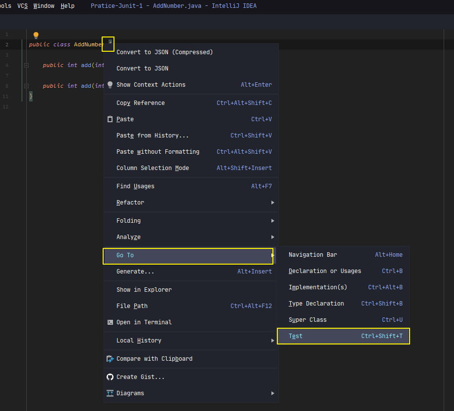 테스트 하고 싶은 클래스 위에 오른쪽 마우스 버튼 클릭> Go To>Test 클릭 (혹은 단축키 사용가능 cCtrl+Shift+T)