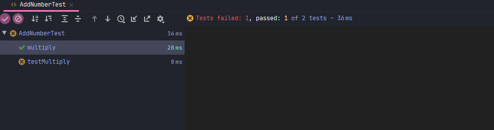 그리고 Test를 실행하면 첫번째 multiply() 는 기대했던 값 17과 동일하여 패쓰 되었고,
