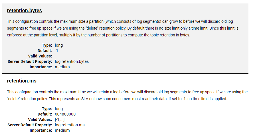 - retention.bytes : byte 단위 기준으로 데이터 보관