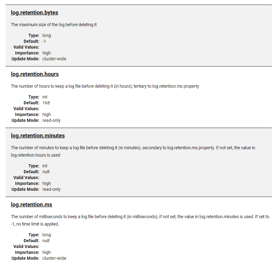 - log.retention.ms : 초 단위 기준으로 데이터 보관