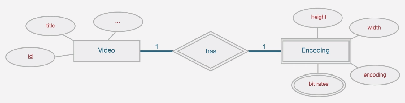 - 예를 들어 Encoding은 Video와의 관계를 명시엥 정의할 수 있고, 의미가 있어진다. 따라서 Encoding은 weak entity에 해당한다.