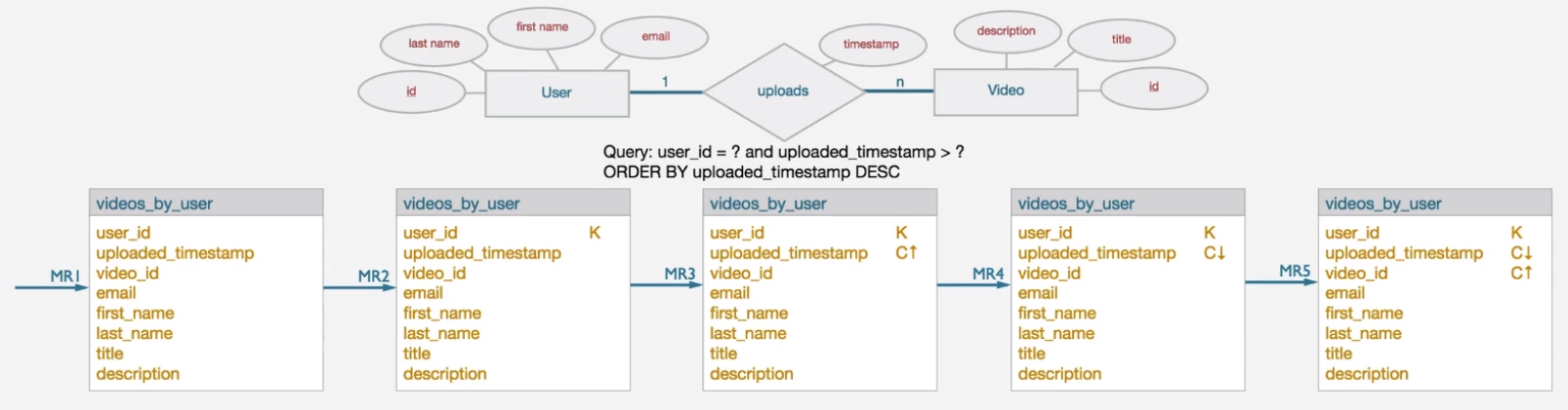 - 순서 속성 : uploaded_timestamp (DESC), video_id(ASC)