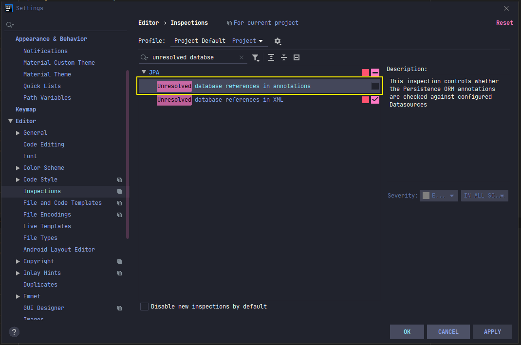 Setting > Editor > Inspection > .. > Unresolved database references in annotations 체크 해제