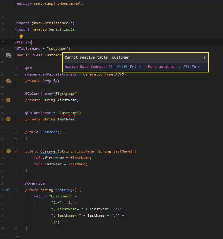 IntelliJ 개발환경에서 Springboot + MariaDB 작업 중, Cannot resolve table ' customer' 에러가 발생했다.