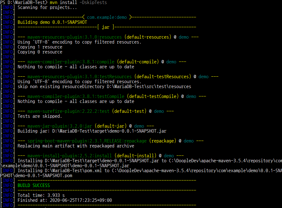옵션을 적용하면 DB 테스트를 건너뛰기 때문에, 정상적으로 빌드되는것을 확인할 수 있다.