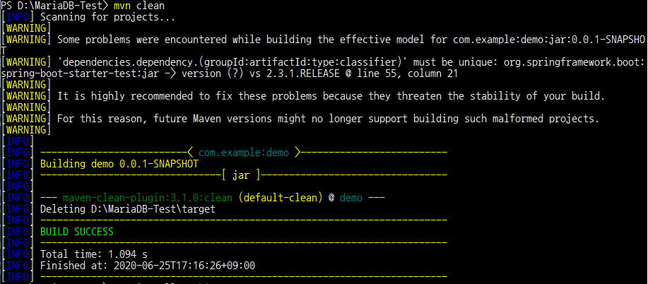 메이븐 명령어 실행 시, 아래와 같은 test 라이브러리 관련 Warning이 발생하였다.