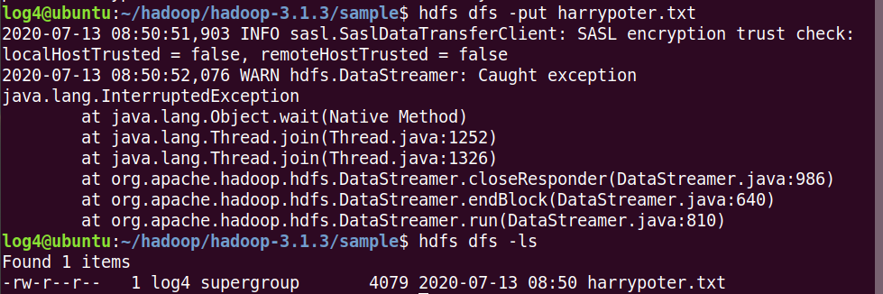 log4@ubuntu:~/hadoop/hadoop-3.1.3/sample$ hdfs dfs -put harrypoter.txt