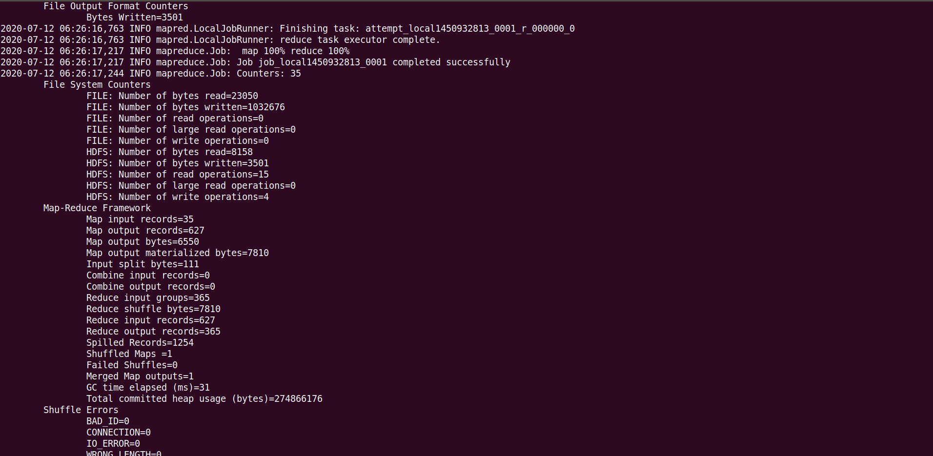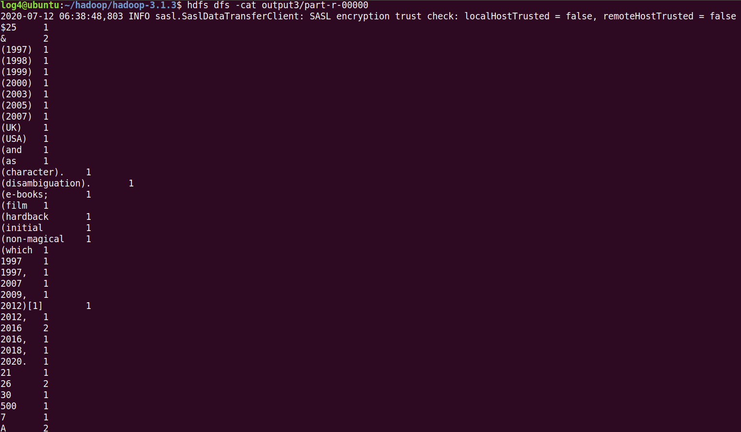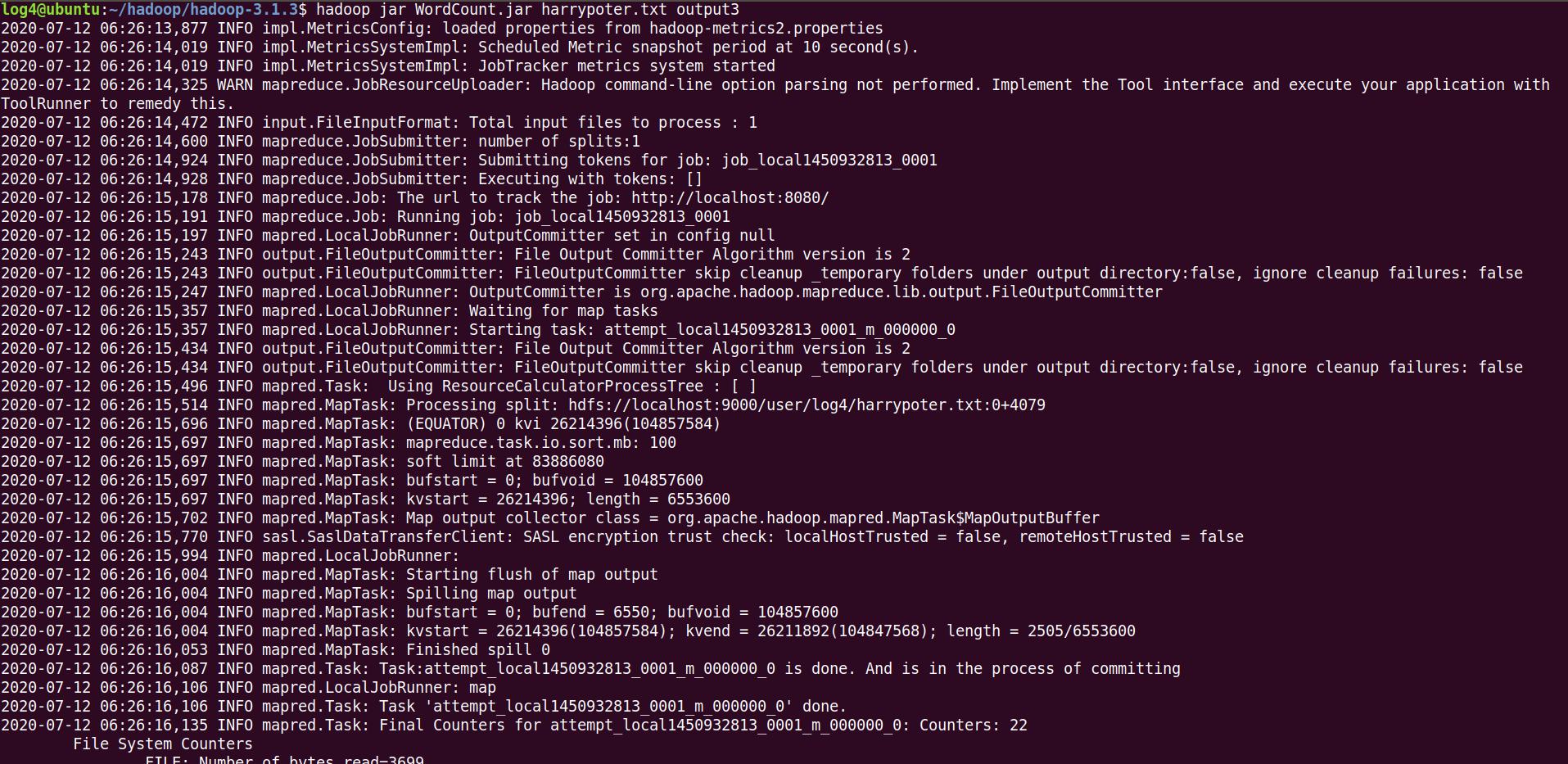 log4@ubuntu:~/hadoop/hadoop-3.1.3$ hadoop jar WordCount.jar harrypoter.txt output3
