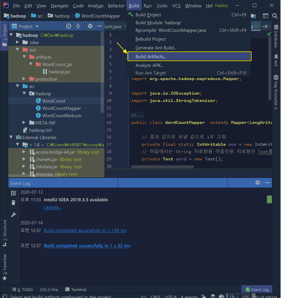 hadoop에서는 sample로 map-reduce jar 파일을 제공하지만, 이 실습에서는 간단한 맵리듀스를 클래스를 생성하여 만든 jar 파일로 진행한다.