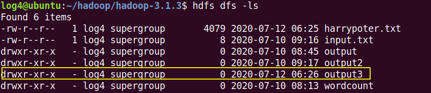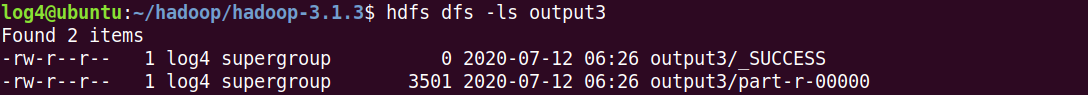 log4@ubuntu:~/hadoop/hadoop-3.1.3$ hdfs dfs -ls output3