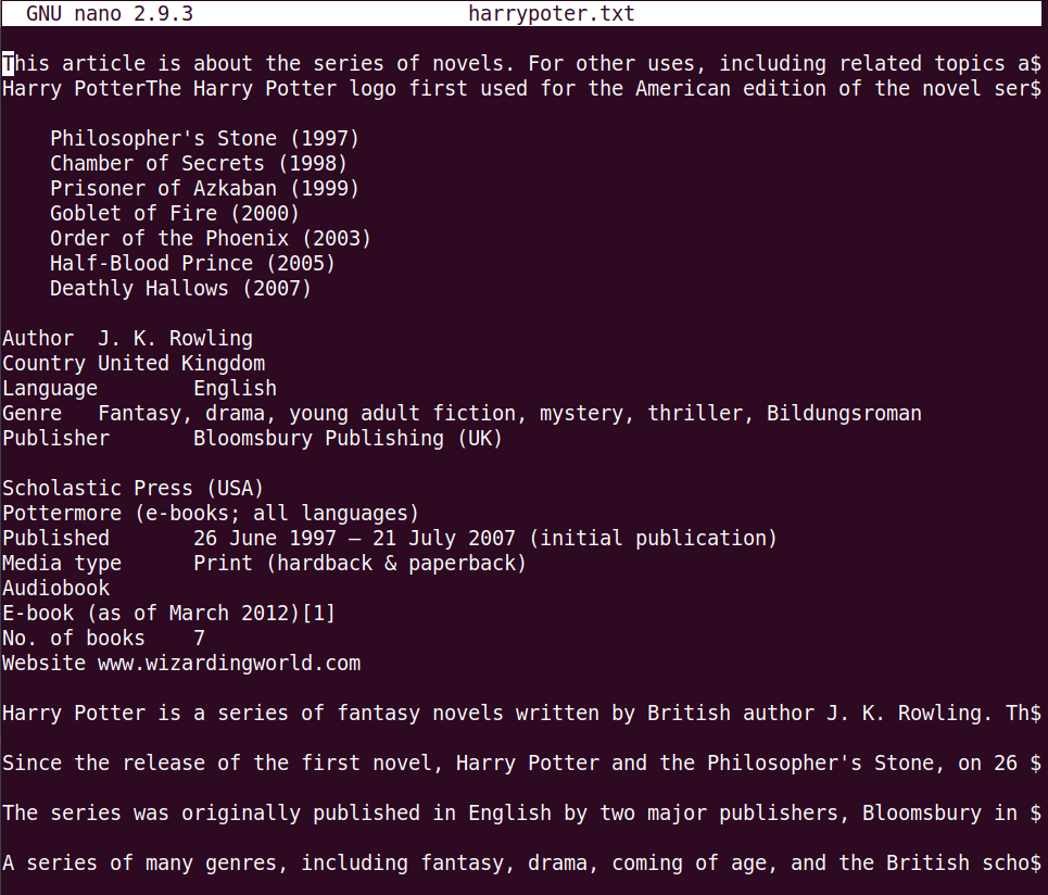mapreduce 테스트를 위해 harrypoter.txt파일을 로컬에 생성한다. txt 파일 안에 내용은 구글링해서 나오는 위키백과의 내용을 복사 붙여넣기 했다.