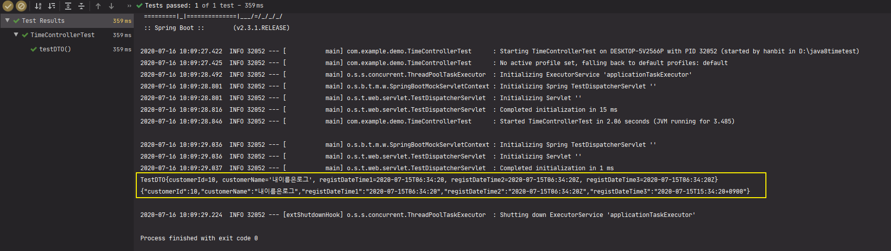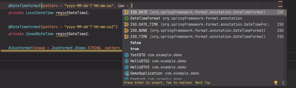 package com.example.demo; import com.fasterxml.jackson.annotation.JsonFormat; import org.springframework.format.annotation.DateTimeFormat; import java.time.LocalDateTime; import java.time.ZonedDateTime; import java.time.Instant; /** * The Class . */ public class TestDTO { private Long customerId; private String customerName; @DateTimeFormat(pattern = "yyyy-MM-dd'T'HH:mm:ss") private LocalDateTime registDateTime1; @DateTimeFormat(pattern = "yyyy-MM-dd'T'HH:mm:ssZ") private ZonedDateTime registDateTime2; @JsonFormat(shape = JsonFormat.Shape.STRING, pattern = "yyyy-MM-dd'T'HH:mm:ssZ", timezone = "Asia/Seoul") private Instant registDateTime3; // Getter, Setter, ToString.. }