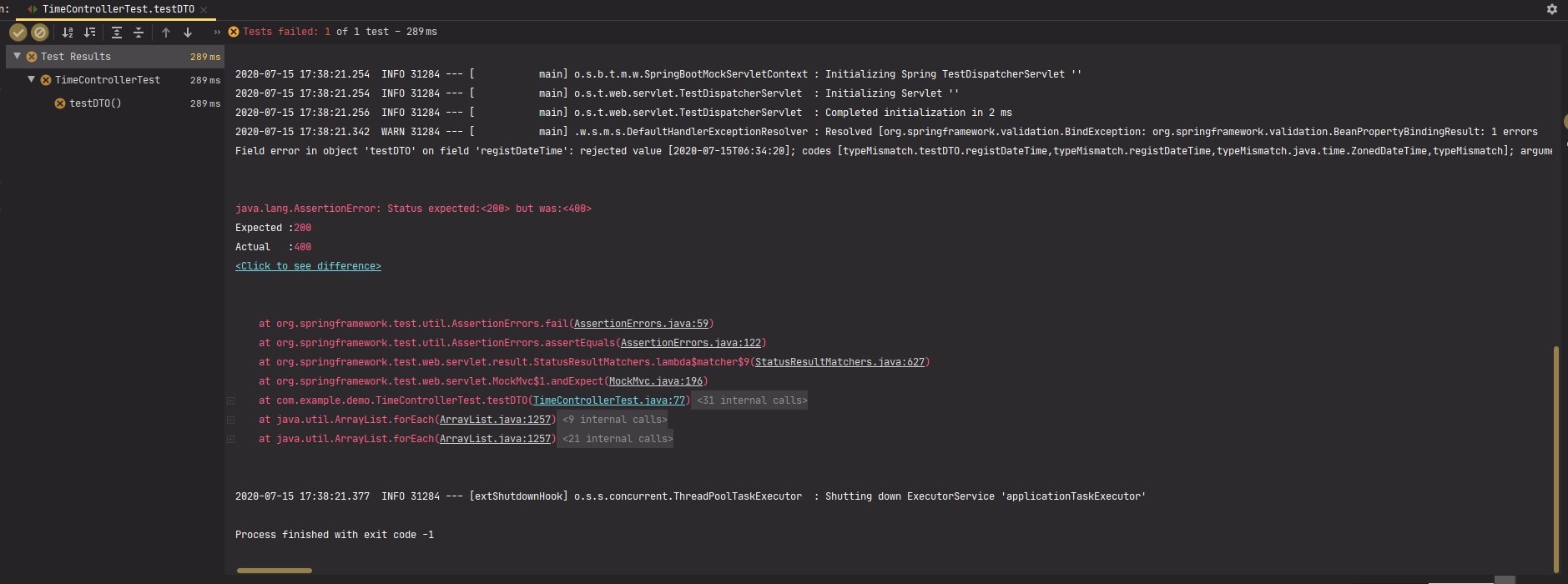 Field error in object 'testDTO' on field 'registDateTime': rejected value [2020-07-15T06:34:20]; codes [typeMismatch.testDTO.registDateTime,typeMismatch.registDateTime,typeMismatch.java.time.ZonedDateTime,typeMismatch]; arguments [org.springframework.context.support.DefaultMessageSourceResolvable: codes [testDTO.registDateTime,registDateTime]; arguments []; default message [registDateTime]]; default message [Failed to convert value of type 'java.lang.String[]' to required type 'java.time.ZonedDateTime'; nested exception is org.springframework.core.convert.ConversionFailedException: Failed to convert from type [java.lang.String] to type [@org.springframework.format.annotation.DateTimeFormat java.time.ZonedDateTime] for value '2020-07-15T06:34:20'; nested exception is java.lang.IllegalArgumentException: Parse attempt failed for value [2020-07-15T06:34:20]]]