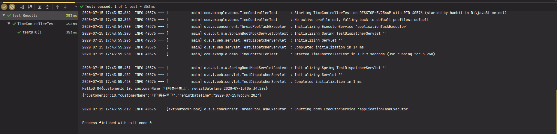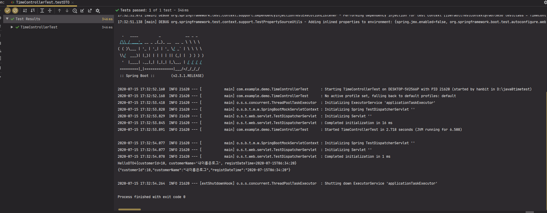 TestDTO, TimeControllerTest 클래스를 수정하여 다시 테스트 진행해보자.