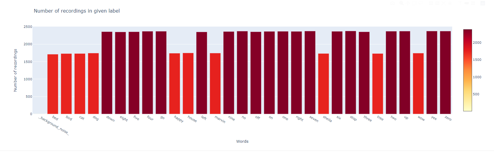데이터 셋은 background_noise 를 제외하고 균형있다. 하지만 다른것도 있다.