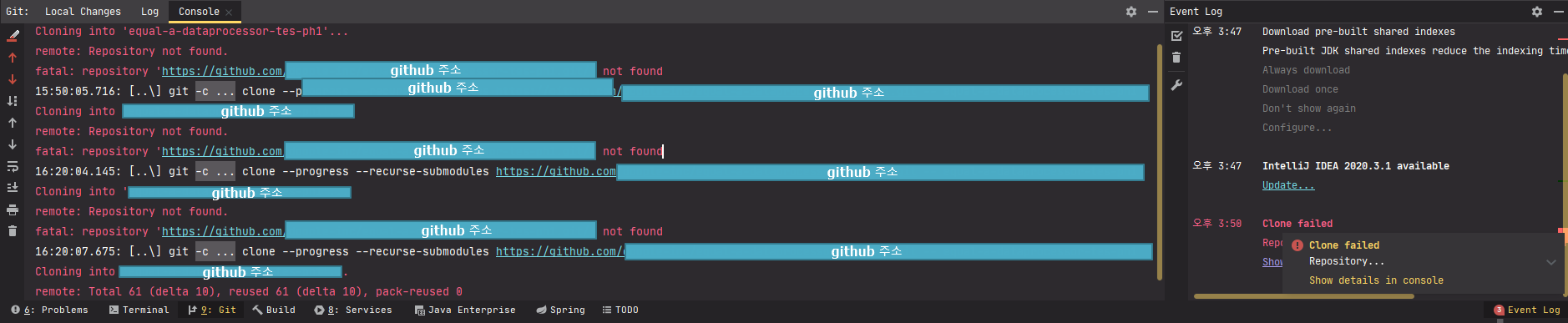 Organizations의 repository를 intellij에 clone 작업하는 중에 아래와 같이 에러가 발생하였다.