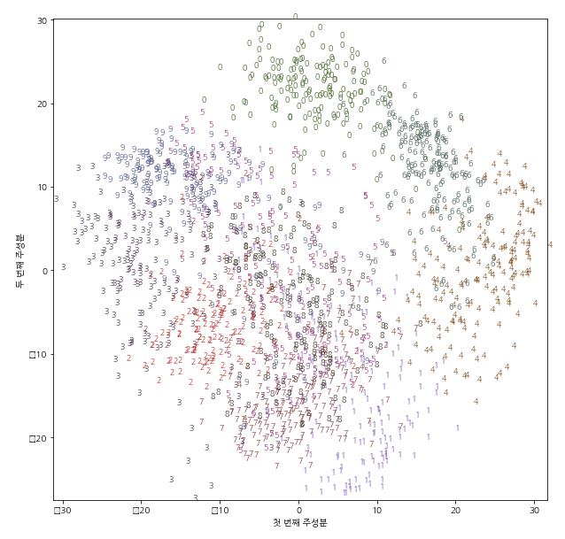 # 처음 두 개의 주성분으로 숫자 데이터를 변환