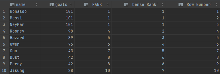 - ROW_NUMBER() : 동률을 반영하지 않는다. 즉, 동일한 등수는 존재하지 않고 모든 행은 다른 등수를 가진다.