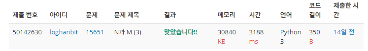 [백준][파이썬] 15649 N과 M(1) 풀이 (0) | 2022.10.21 |