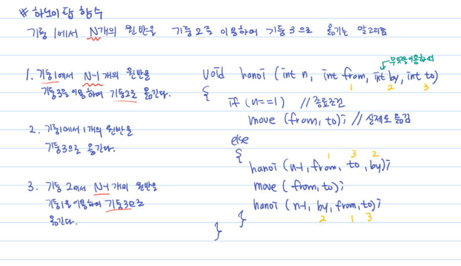 - 하노이탑.. 손으로 해봤지만 시간이 오래걸릴 것 같아 유투브 강의를 참고하였다.